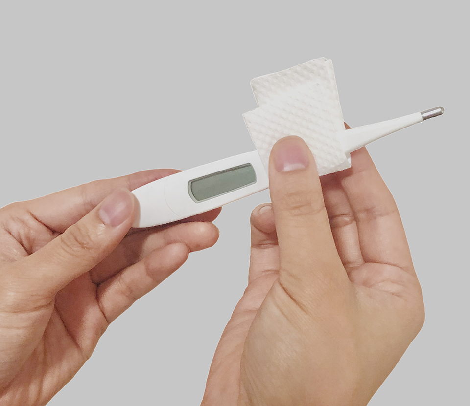 病院などの医療施設では、入院している患者さんの場合は専用の体温計を用意したり、外来では、防水機能付きの電子体温計を使ったりして、使用後にはその都度洗浄と消毒を必ず行い、清潔を保ち、体温計を介して感染症が広がることを防いでいます。