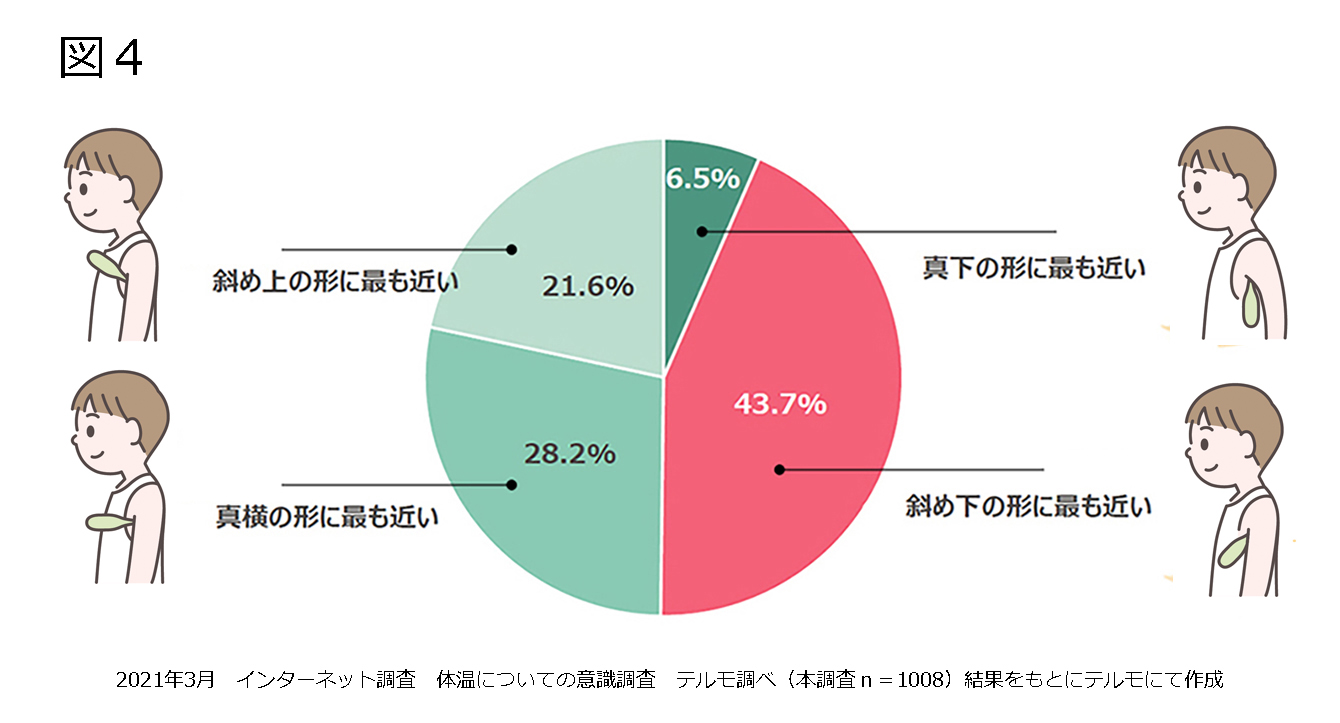 正しい検温方法は、棒状体温計を「斜め下から」入れる方法です。間違った検温方法をしている人が半数以上もいることが分かりました。(図4)
